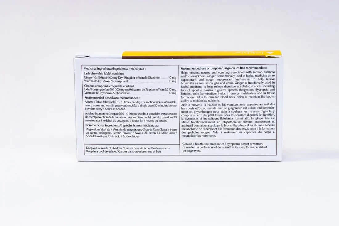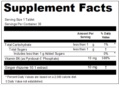 A powerful combination of ginger and B6 to fight your toughest nausea symptoms. Helps prevent nausea and vomiting associated with motion sickness and/or seasickness. Ginger is traditionally used in herbal medicine as an expectorant and cough suppressant (antitussive) to help relieve bronchitis as well as coughs and colds. Ginger is traditionally used in herbal medicine to help relieve digestive upset/disturbances, including lack of appetite, nausea, digestive spasms, indigestion, dyspepsia and flatulent colic (carminative). Helps in energy metabolism and in tissue formation. Helps to form red blood cells. Helps to maintain the body's ability to metabolize nutrients.