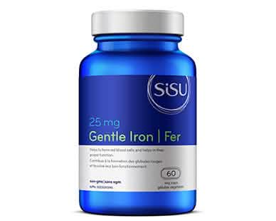 Sisu Gentle Iron capsules contain 25 mg of elemental iron from the bisglycinate form, which is better absorbed and easier on the stomach than other forms of iron. This form is less likely to cause stomach upset or constipation, which can occur with iron supplementation. It is recommended to take this product with vitamin C or Sisu's Ester-C for improved absorption; it can also be taken with a B complex or multivitamin containing B12 and folic acid for additional support for red blood cell manufacture.