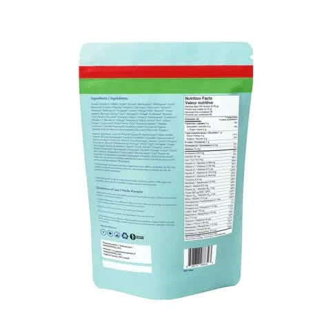 Ingredients: Acacia*, Spirulina*, Alfalfa*, Apple*, Spinach*, Barley grass*, Wheatgrass, Inulin Beet root*, Carrot*, Chlorella*, Pumpkin*, Tart cherry*, Maca root*, Turmeric*, Mulberry*, Wild cherry*, Pineapple*, Lemon*, Mango*, Kale*, Broccoli*, Sweet potato*, Moringa*, Parsley*, Acai*, Astragalus*, Chaga*, Cordyceps*, Burdock root*, Reishi*, Olive leaf*, Ginseng*, Celery*, Tomato*, Pomegranate*, Cranberry*, Raspberry*, Blueberry*, Orange*, Strawberry*, Black currant*, Kiwi*, Grape*, Ginger*, Camu camu*, Maqui berry*, Goji*, Cinnamon powder*, Maitake mushroom*, Shiitake mushroom*, Sunflower seed*, Coconut oil, Natural flavours, Stevia extract*, Citric acid, Malic acid, Xanthan gum.