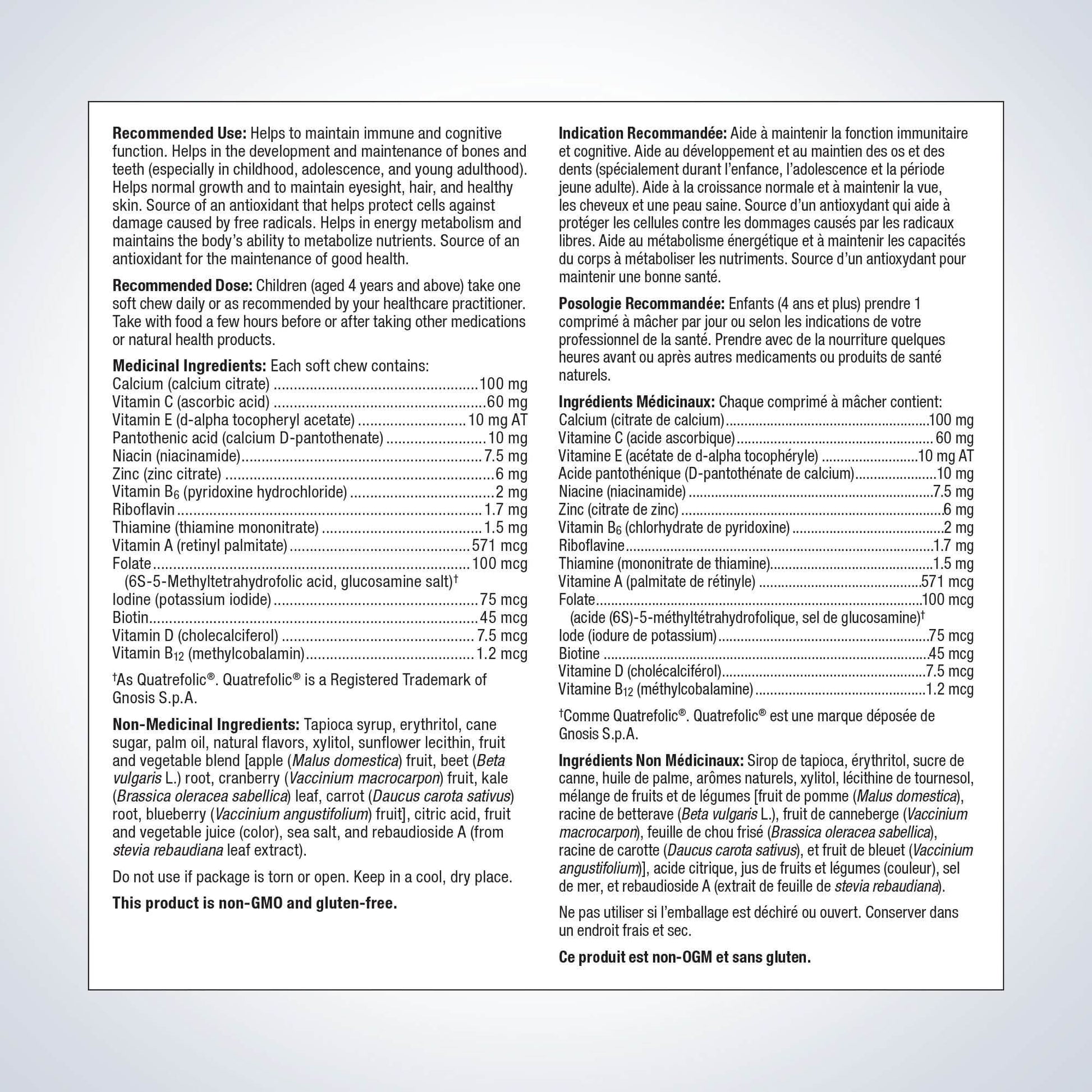 Non-Medicinal Ingredients: Tapioca syrup, erythritol, cane sugar, palm oil, natural flavors, xylitol, sunflower lecithin, fruit and vegetable blend [apple (Malus domestica) fruit, beet (Beta vulgaris L.) root, cranberry (Vaccinium macrocarpon) fruit, kale (Brassica oleracea sabellica) leaf, carrot (Daucus carota sativus) root, blueberry (Vaccinium angustifolium) fruit], citric acid, fruit and vegetable juice (color), sea salt, and rebaudioside A (from stevia rebaudiana leaf extract).