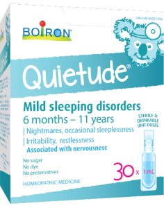 Quietude is a homeopathic medicine for the relief of mild sleeping disorders (nightmares, night terrors, occasional sleeplessness), irritability and restlessness associated with nervousness.